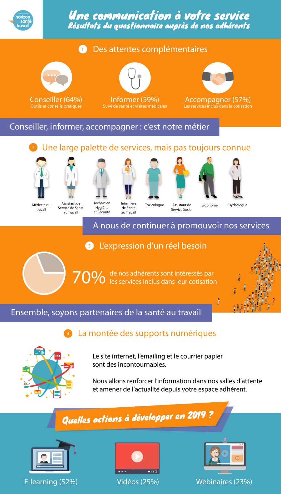 L’équipe communication d’Horizon Santé Travail cherche constamment à répondre aux besoins de nos adhérents. Afin de mieux comprendre vos attentes, nous avons choisi de déployer un questionnaire auquel vous avez été nombreux à répondre.